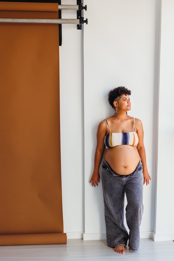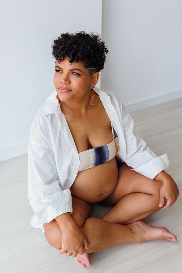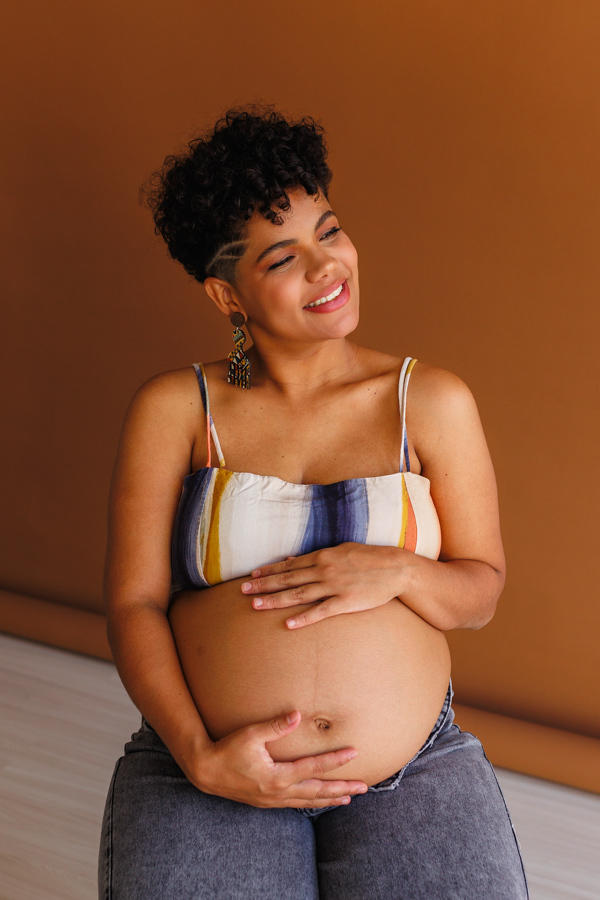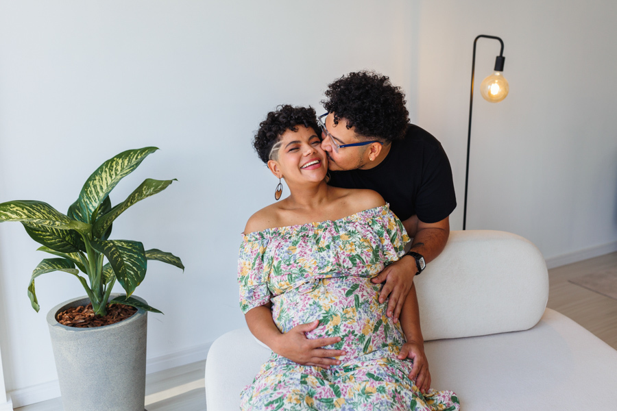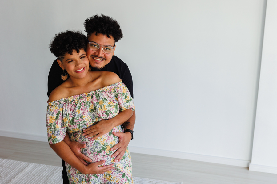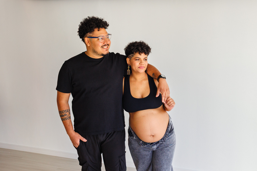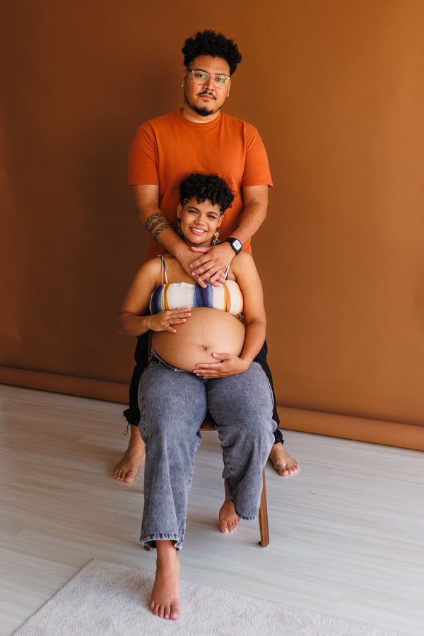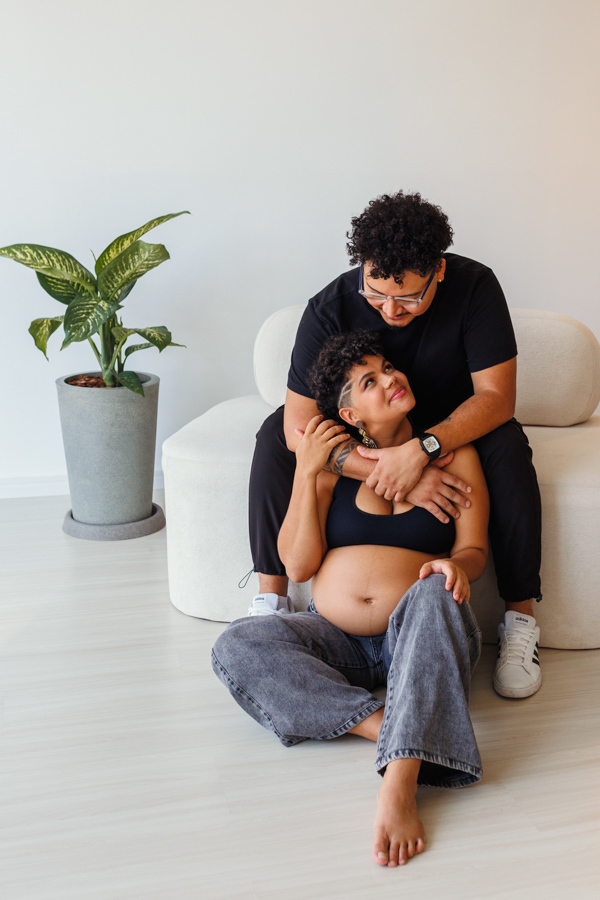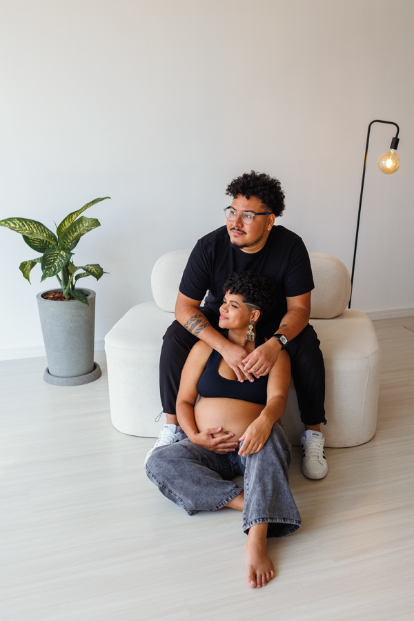 O ensaio gestante aconteceu no estúdio, com uma proposta leve, elegante e atemporal. Fizemos fotos da Gabi sozinha, valorizando toda a beleza dessa fase, e também registramos a conexão do casal, de um jeito natural, espontâneo e cheio de carinho.