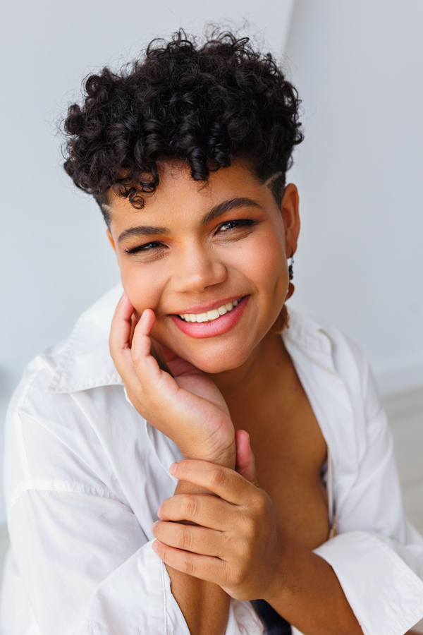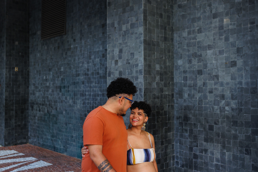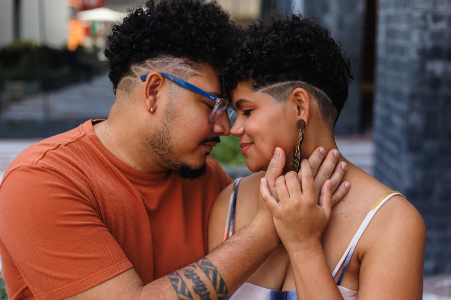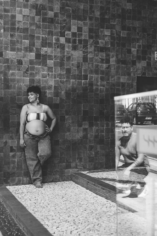 Depois, descemos para a parte de baixo do prédio e aproveitamos o ambiente externo para fazer algumas fotos ao ar livre. Isso trouxe ainda mais variedade para o ensaio, misturando a praticidade e o conforto do estúdio com um toque mais urbano e espontâneo.