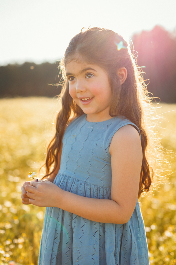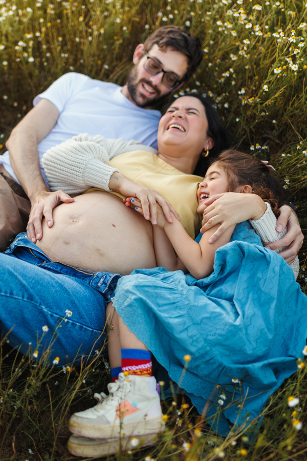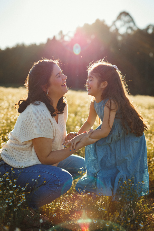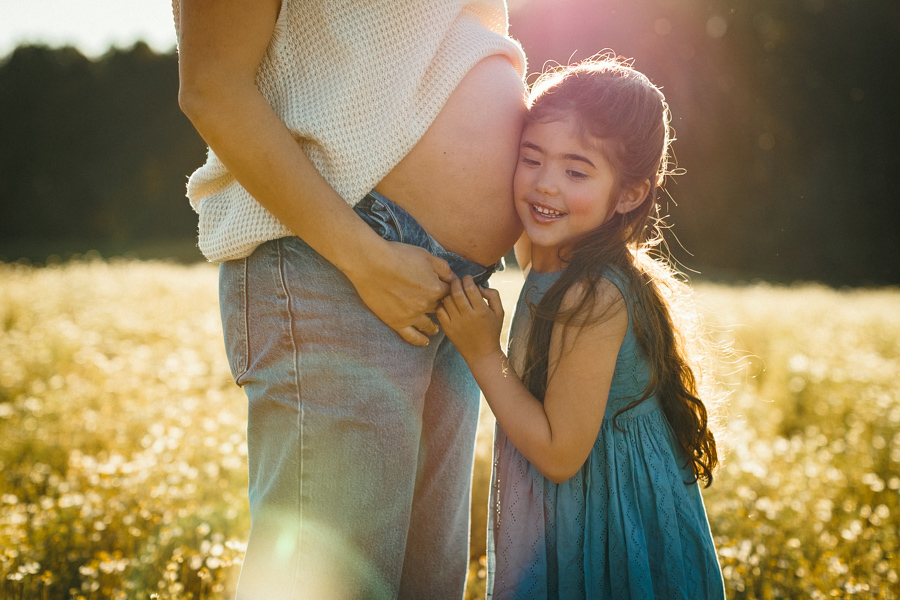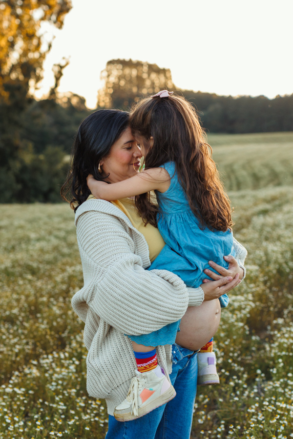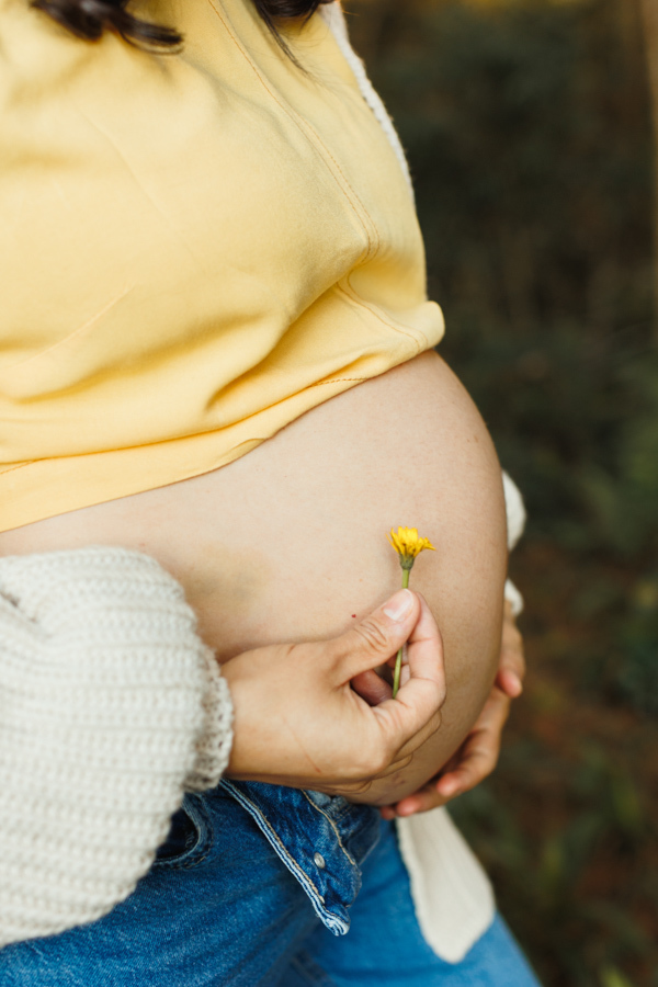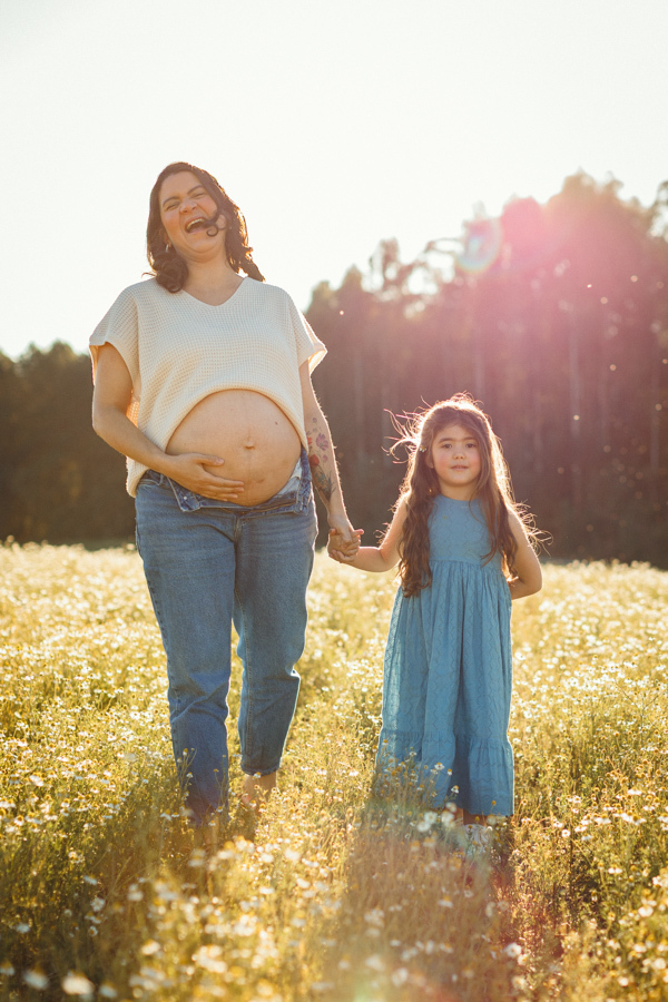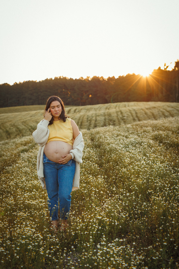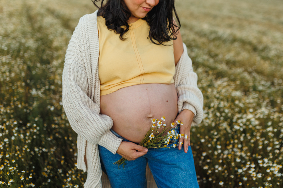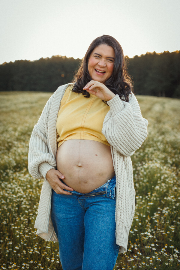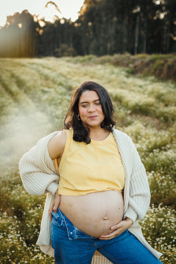O ensaio gestante da Nina aconteceu ao ar livre, em um campo de camomilas, cercado de natureza, luz suave e muito significado.